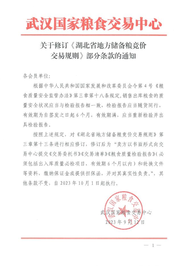 关于修订《湖北省地方储备粮竞价交易规则》部分条款的通知